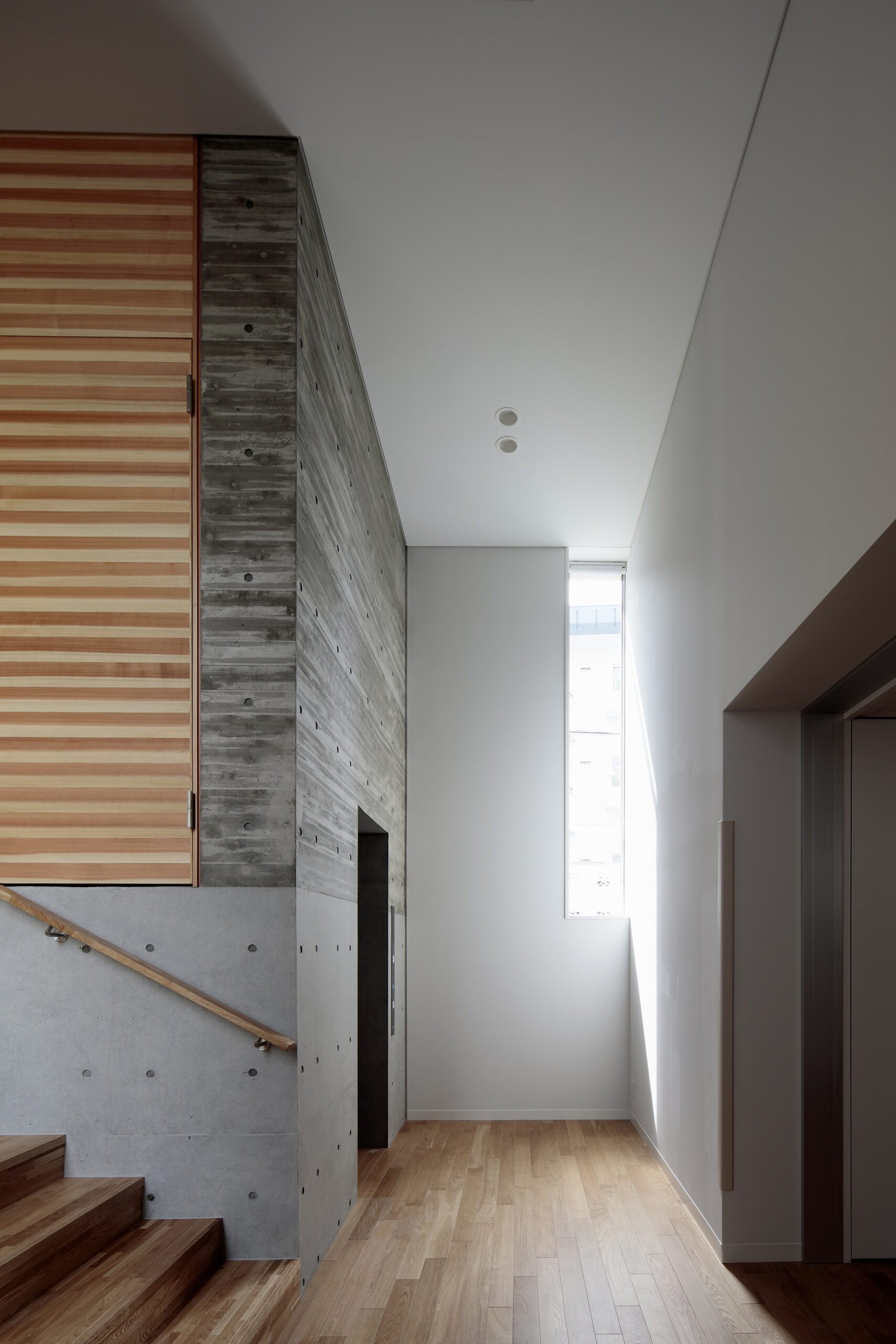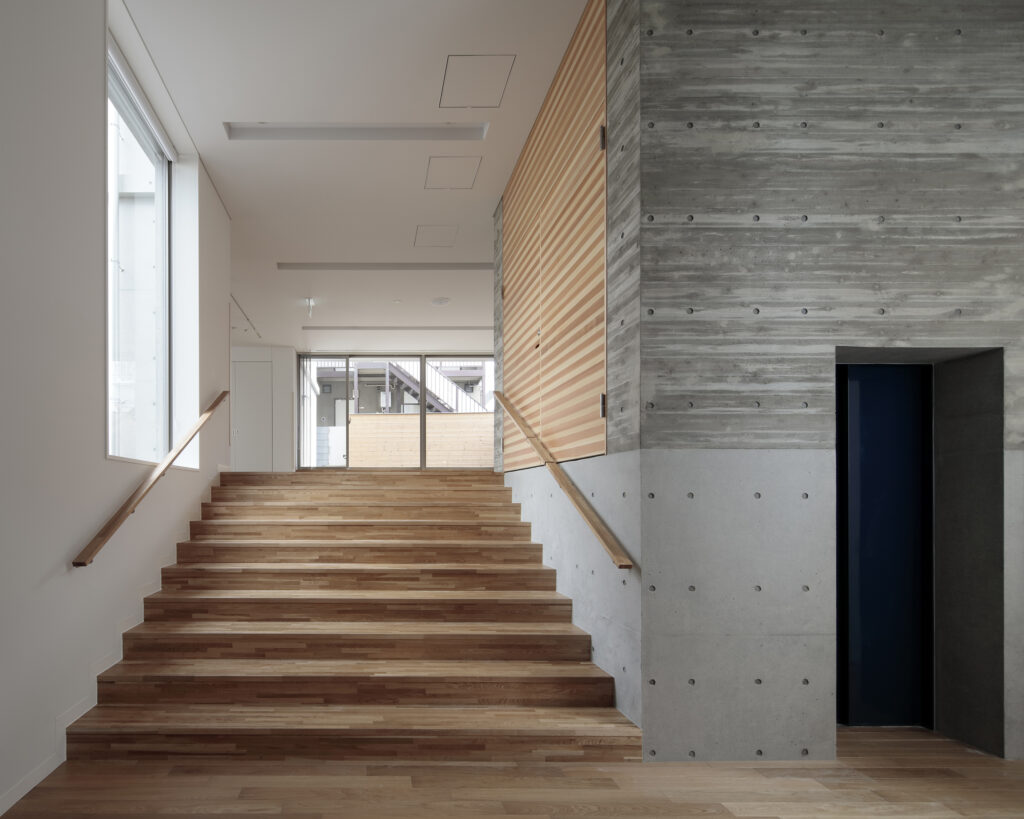 計画地は既存建物の土地から約1.5M高い土地でしたが、この高低差を 前向きに生かして室内に様々な天井高を持たせることで、変化があり楽しく親しみの持てる空間となることを目指しています。