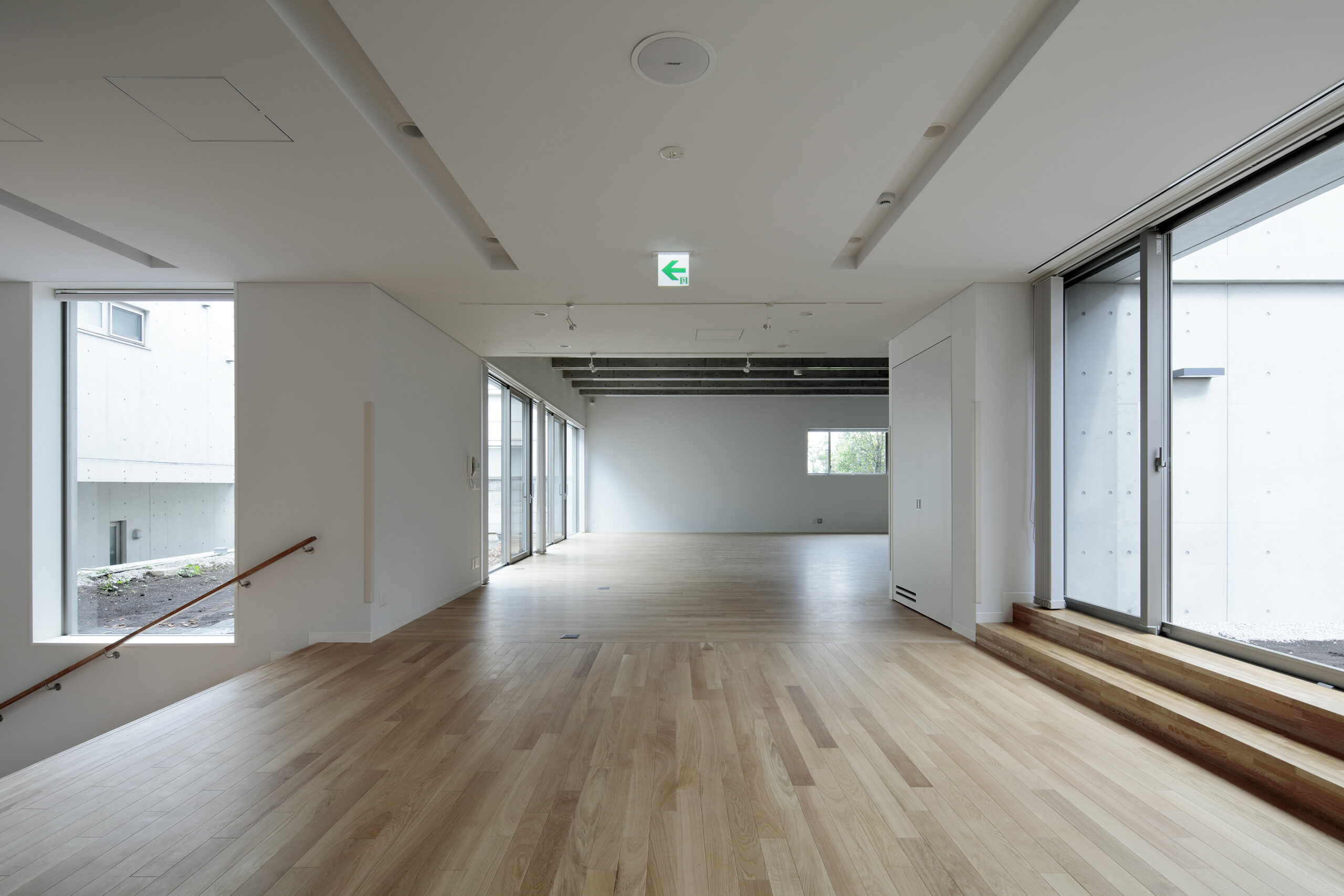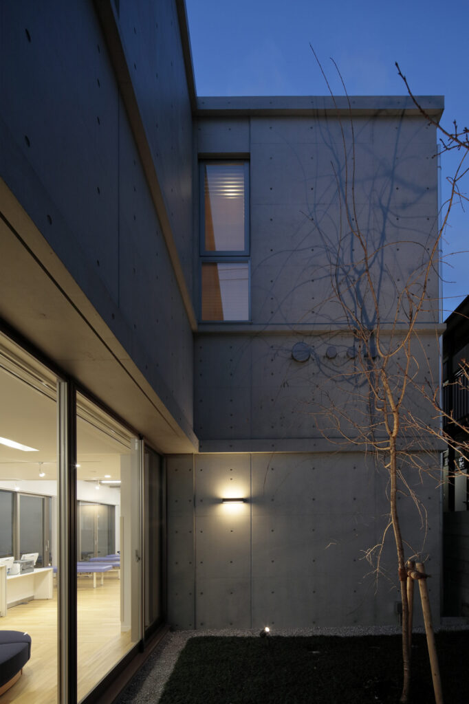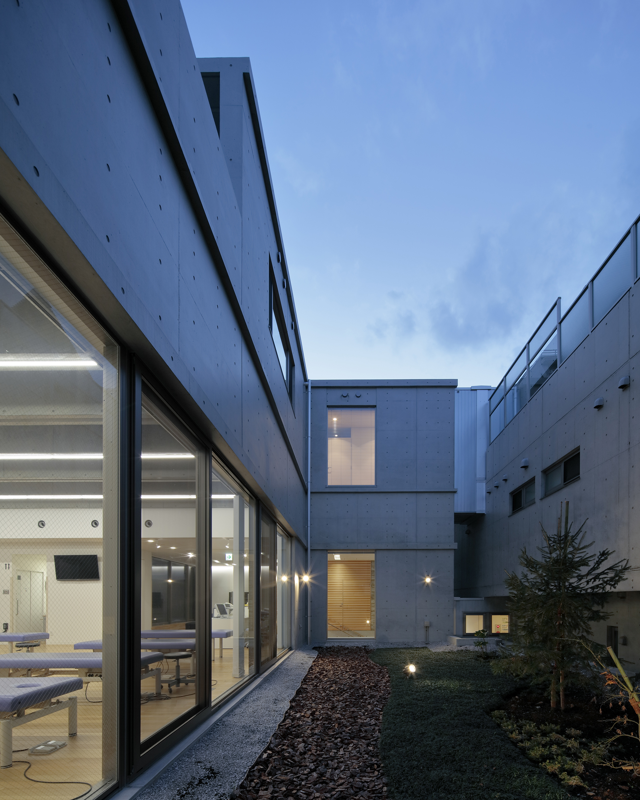 既存のリハビリ室が地下に設けられていたこと、隣家が比較的密集して 建つことなどから、性格の異なる2つの庭を設け、リハビリ室はメインの中庭に目一杯開放的なつくりとしました。中庭を通して既存リハビリ室に 対しても採光や通風環境が改善する計画としています。