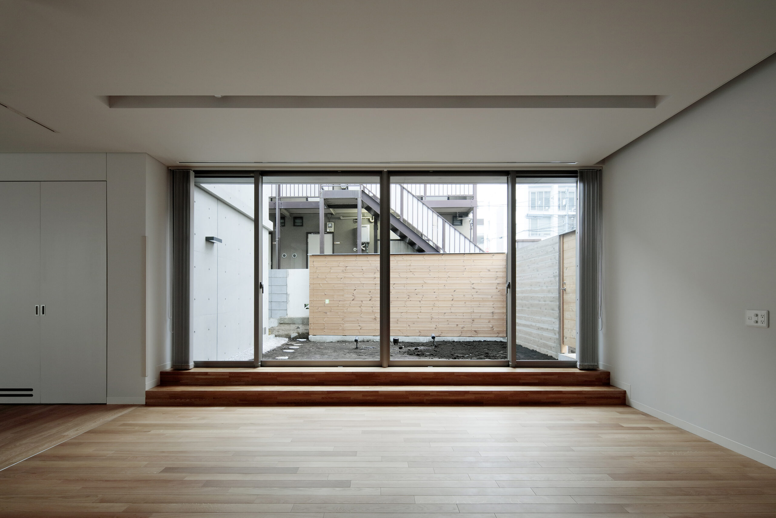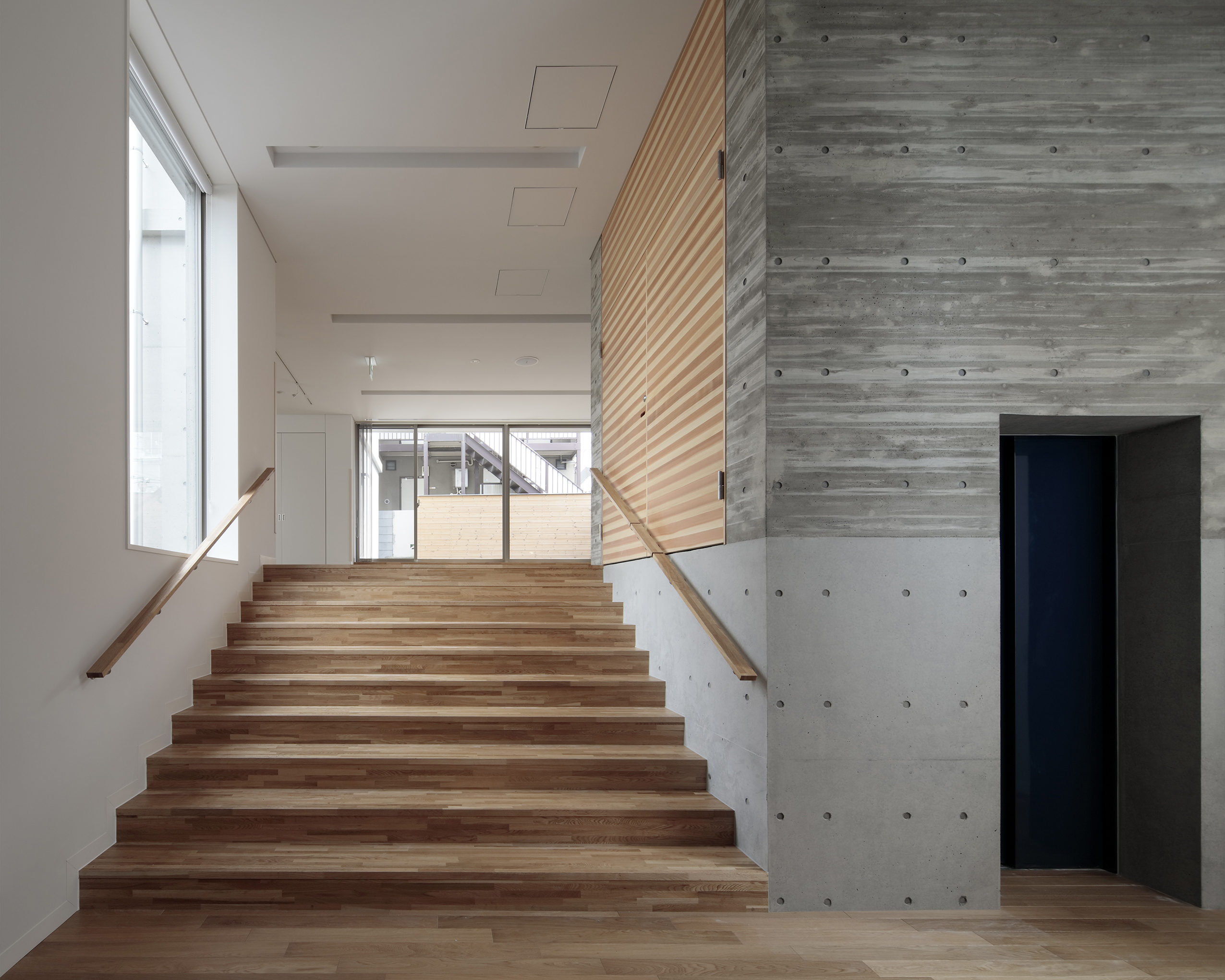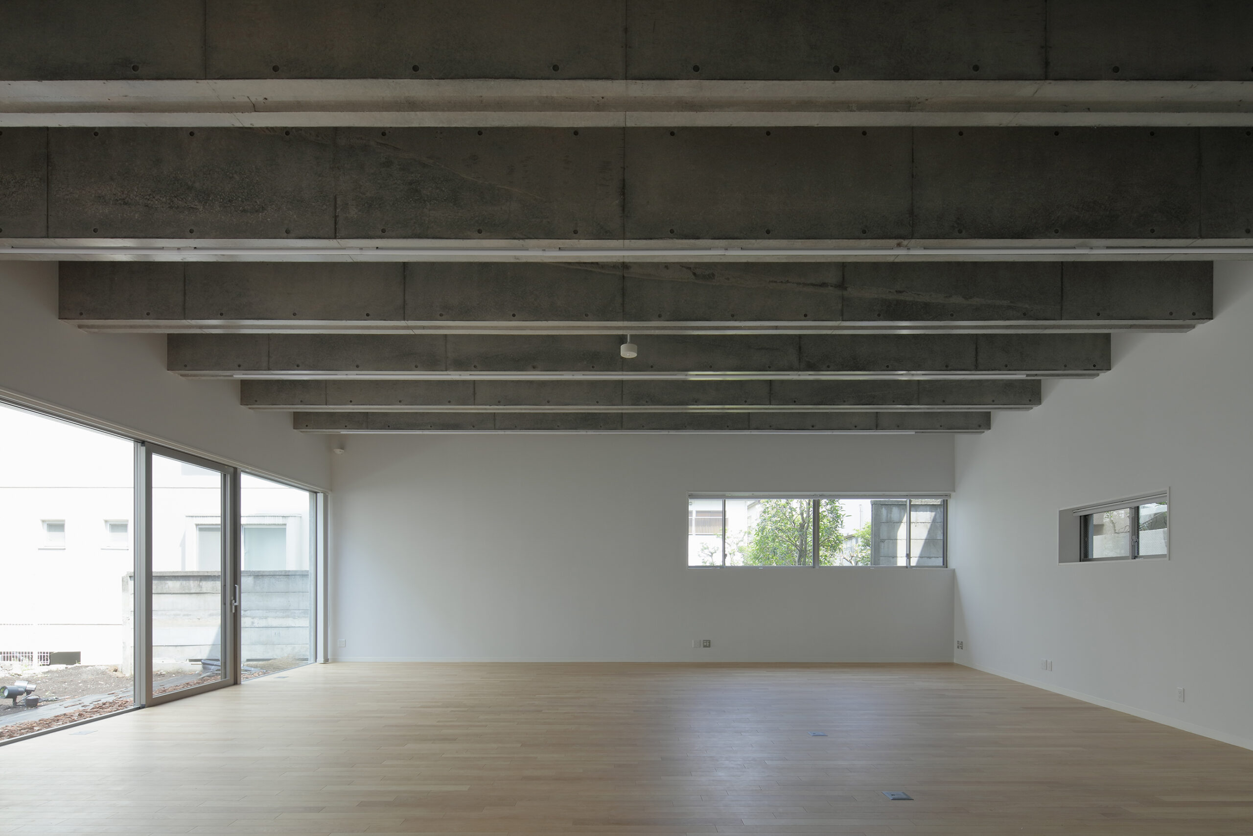 既存のリハビリ室が地下に設けられていたこと、隣家が比較的密集して 建つことなどから、性格の異なる2つの庭を設け、リハビリ室はメインの中庭に目一杯開放的なつくりとしました。中庭を通して既存リハビリ室に 対しても採光や通風環境が改善する計画としています。
