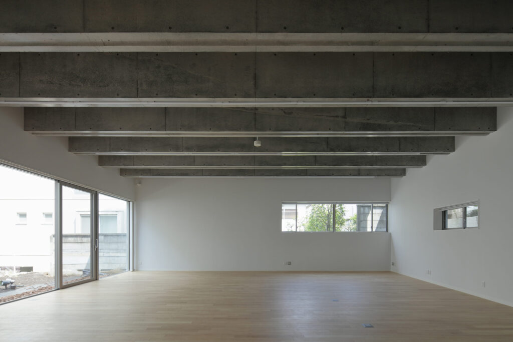 リハビリ室はサービス内容の変化や日々進歩するリハビリ機器の交換に 伴って配置変更を容易に行えることが重視され、室内に柱が出ることは好ましくないため、RC厚肉ラーメン構造と連続梁を採用することで10M×12 Mの無柱大空間を確保しました。