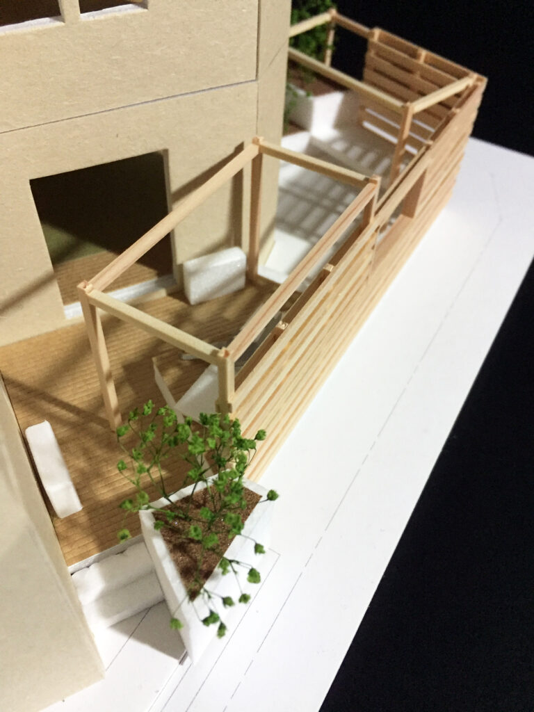 そこで、庭の主なスペースについて、外周に視線を遮る背の高いフェンスを設けるとともに、床も新しい材料で一面デッキ張りにすることで、日々気軽に使え、広がりがあって寛げる庭になるよう計画しています。