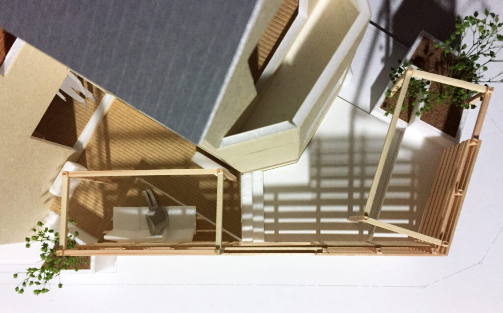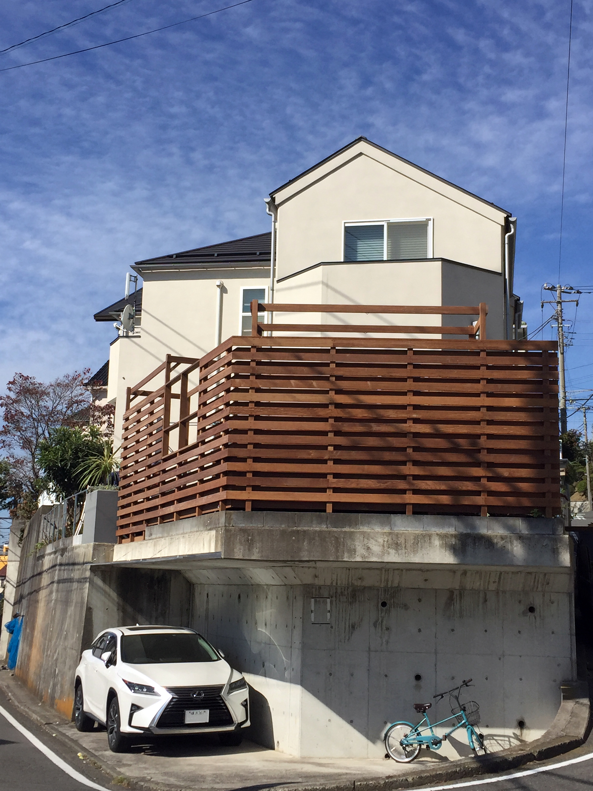 以前に住宅改修の仕事(白楽の家)をいただいたクライアントから新たに依頼されて行った庭の改修デザイン。元々あった庭は前の所有者以来の状態で使われていて、木製デッキの老朽化が目立ち始めており、また庭の作りは開放的な反面開けっぴろげで、クライアントの望む落ち着いたスタイルに適っていなかったことに加え、デッキ部分とその他の庭が分割された格好で、実際の面積ほど広さを感じられないという課題がありました。