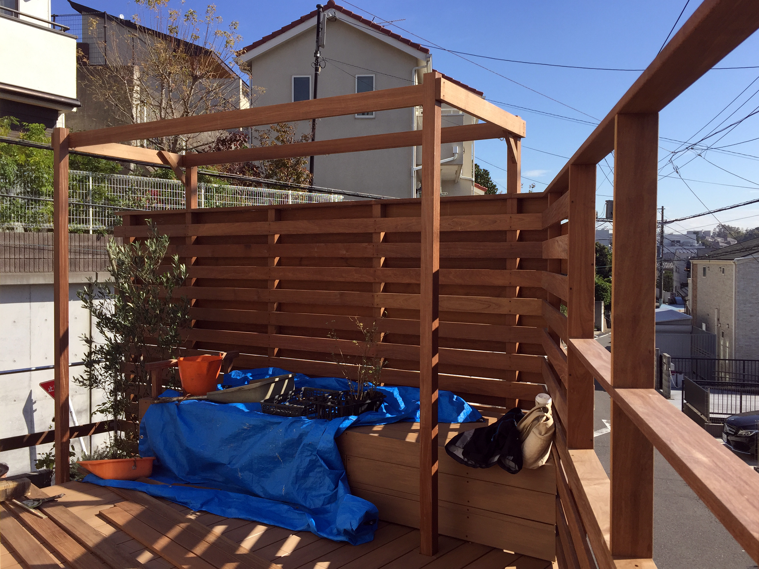 フェンスは、イペ材(耐久性が高く落ち着いた雰囲気がある)を隙間を開けて横張りにしており、視線を遮りながら風通しを良くしています。また屋内のプライバシーや庭の落ち着きを妨げない位置に”窓”を設けることにより、極端に囲い過ぎて周囲を拒絶する格好にならないようにしています。なお、敷地は斜面地で風を遮るものが少ないため、強風への対策は入念に考えました。風通しの良いフェンスの張り方はその対策の一つでもありますが、構造的な補強のためフェンスの内側にフレームを2箇所設けて います。このフレームは、シェードを張ることで夏の厳しい日差しを遮るパーゴラとしての機能も持たせており、その下には寝そべることもできる ゆったりとした広さのベンチも設けています。